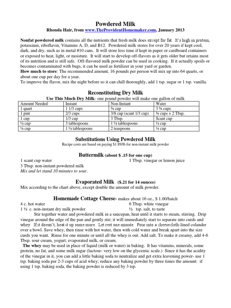 1 cup milk = 1 cup water + 3 tablespoons powdered milk 3/4 cup milk = 3/4 cup water + 2 1/4 tablespoons powdered milk 2/3 cup milk = 2/3 cup water + 2 tablespoons powdered milk 1/2 cup milk = 1/2 cup water + 1 1/2 tablespoons powdered milk 1/3 cup milk = 1/3 cup water + 1 tablespoon powdered milk. Powdered milk 1 cup milk ¾ cup water 2 ¼ t. See full list on hillbillyhousewife.com To get your desired amount of milk, simply multiply the number of cups by ¼. To equal this amount of liquid milk: